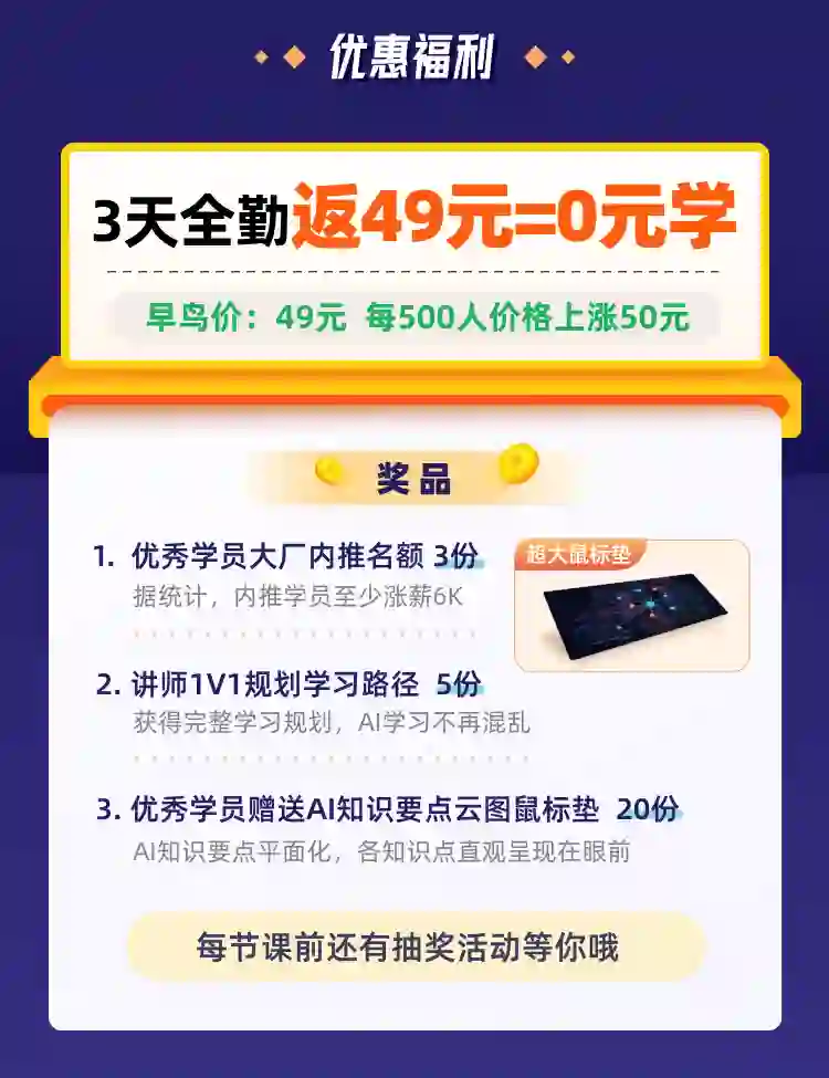 你只需支付 49元 的预定金,然后做到 3 天全勤打卡 , 49 元预定金会在结课后 3 天内全部退给大家。这些个标准其实并不难,如果你态度认真,努努力就能做到。