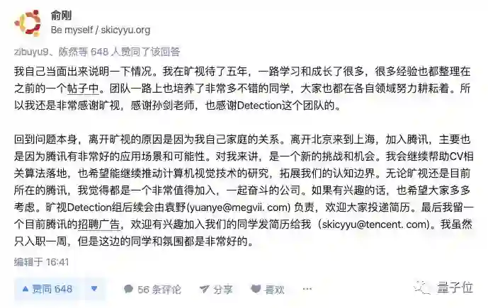 在俞刚对离职情况进行回应之后,他也在知乎上发出了“腾讯光影研究室”的招聘帖。