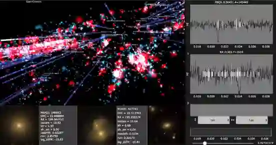 接下来,Forbes教授介绍了IGM VIS项目,该项目开发了一个星系数据可视化系统,通过分析星系介质数据帮助天文学家更好地理解星系的生成和演化。该系统利用3D交互式可视化帮助用户从不同角度观察、选择并分析来自多个数据集的星系数据(如图3),图中左上的主要视图是星系的3D可视化图,右方线状图展示了天文学家最关注的星系吸收速率数据。通过该项目,Forbes教授强调了可视化项目的设计流程中通过合作充分了解用户需求并清晰定义任务的重要性。