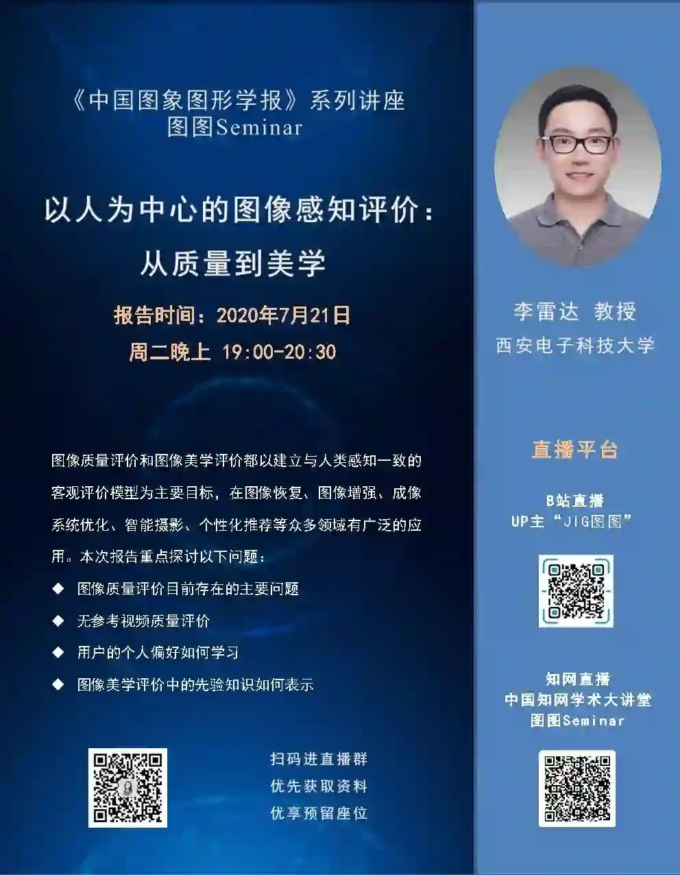 本期“图图Seminar”特别邀请西安电子科技大学李雷达教授,为大家带来“以人为中心的图像感知评价:从质量到美学”的报告,分享图像质量评价的基础和前沿。