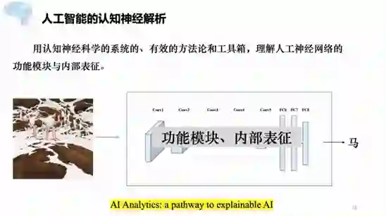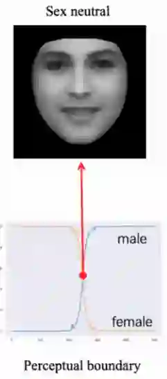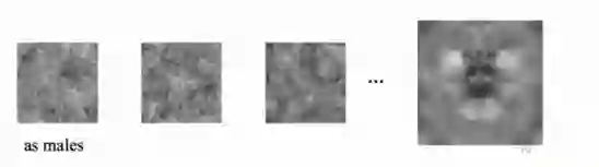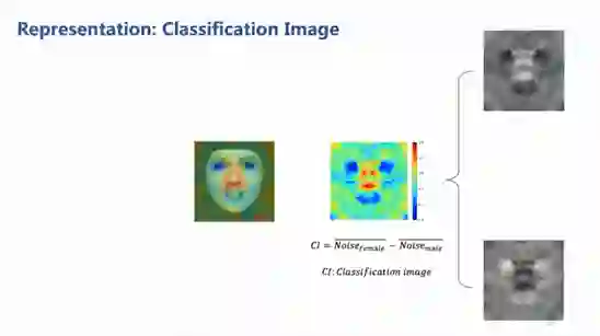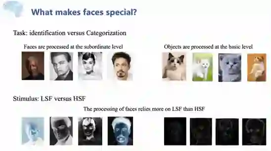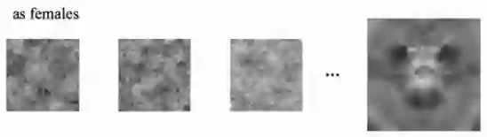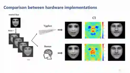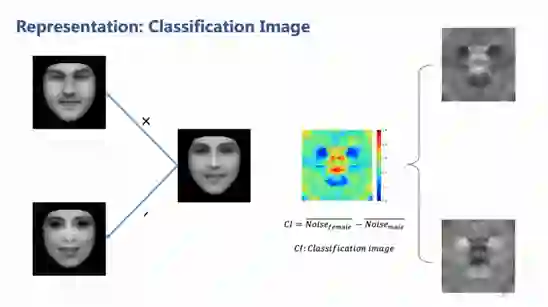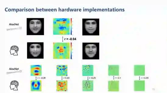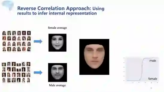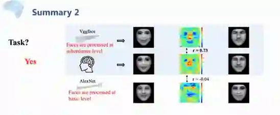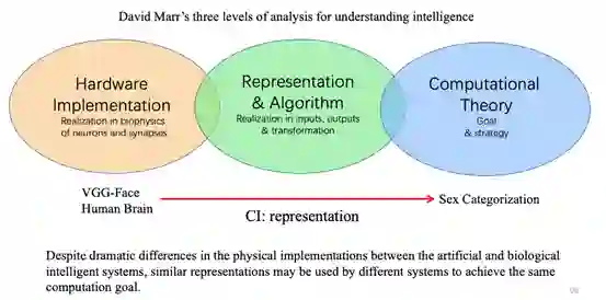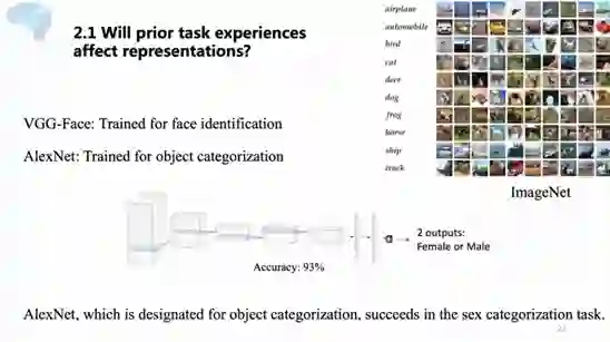 首先,我们来验证第一个可能性:共同的任务经验。这里,我们选择AlexNet。AlexNet也是预训练网络,它不做面孔识别而做物体分类,我们把最后一层微调,让它做识别男性和女性的分类任务,正确率93%。即,虽然AlexNet是用来训练物体分类的,但是也能够把男性和女性区分,正确率也相当高。现在问一个有趣的问题,AlexNet在性别辨认上也能达到和人一样的准确度,但是AlexNet用的是和人类似的表征吗?我们来看AlexNet辨别男性和女性的特征图,如下图所示,肉眼能够辨别两者存在非常大差别,基本不相关,相关度等于-0.04。我们把它叠加到原来的基底图上去,得到的人脸也没有明显的性别特征。所以从这个角度来讲,我们发现AlexNet虽然能够区分男性和女性,但是它所用的表征是完全不一样的。我们做进一步的空间频率分析,把噪音特征图分为不同的空间频率,可以看到,基本上AlexNet和人类的各频率的噪音特征图是不相关的。回到实验的第一部分结论,我们发现预训练任务非常重要。为什么VGG-Face和人类在区分男性女性时用的表征是相似的?因为它们都被训练在个体层面上进行加工,而AlexNet是在类的层面上进行加工,从这个角度来讲,导致它们使用呢不同的表征。这一点我们可以从进化的角度来理解。我们之所以从单细胞变成现在多细胞的动物,就是因为我们在不断地完成大自然交给我们的任务;一旦完成不了,那只有一个结果,就是基因被淘汰。也就是说,we are what we do。我们的智能是被我们过去所完成的任务所决定的。