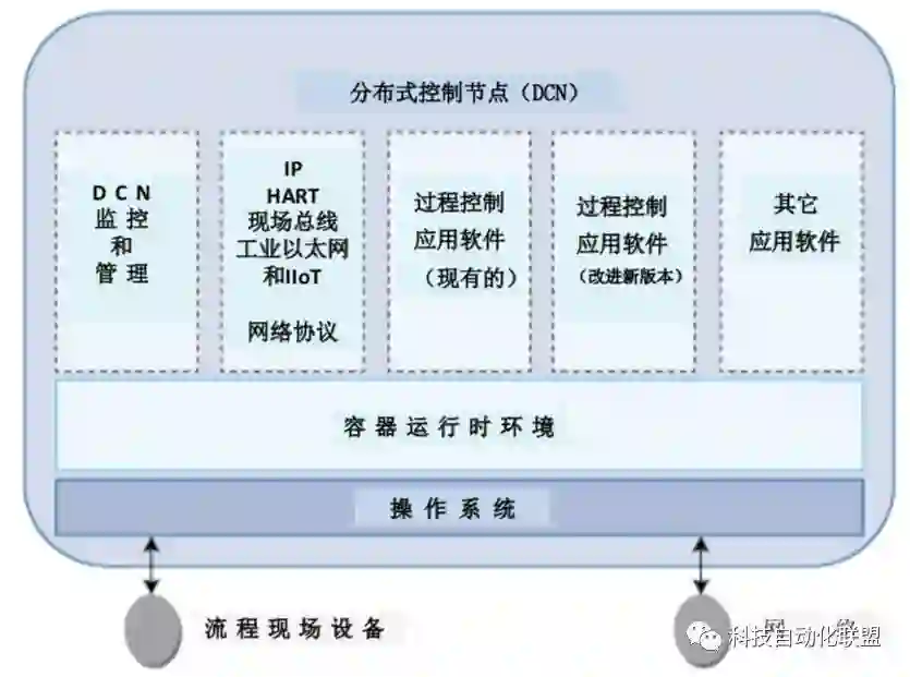 图4则表示如何将容器技术运用于OPAF的架构,构成一个分布式控制节点DCN。根据实际需要,可在在一个DCN容器中容纳所需要的各种APP,如监控和管理DCN的APP、现场总线和工业以太网的APP、现有的过程控制算法APP、新开发的过程控制算法APP等等。