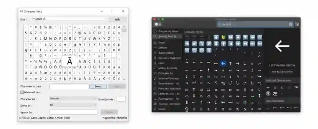 Windows 的情况则稍微麻烦一些。Windows 的默认键盘布局没有提供太多符号输入组合键;由于软件开发环境相对割裂,也很难提供系统层面的文本替换功能,基本需要依靠各个应用自行支持(例如 Word 的自动更正)。不过,Windows 内建了一个称作「字符映射表」(Character Map)的输入面板,可以在开始菜单的附件中找到;同时,系统的很多位置可以通过输入字符的 Unicode 编码,然后按 Alt + X 组合键来获得该字符(例如,输入 221A 后按 Alt + X 即可得到根号 √)。