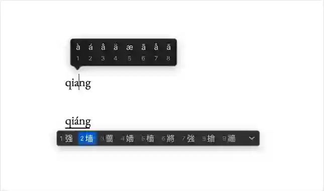 带声调字母的输入在 iOS 上非常简单:只要按住对应的字母键,就可以在弹出的浮动条中看到它们。这一技巧同时适用于中英文输入法,但带上声 ˇ 的字母只在中文键盘上才能找到。macOS 上,最简单的方法是切换到中文输入法,直接输入需要注音的字的拼音,然后按 Tab 键,就会发现韵母上出现了声调。反复按 Tab 直到看到所需的声调,然后直接回车即可上屏。另外,较新版本的 macOS 借鉴了 iOS 上的交互方式,长按键盘上的普通字母即可看到与其相关的带声调版本。
