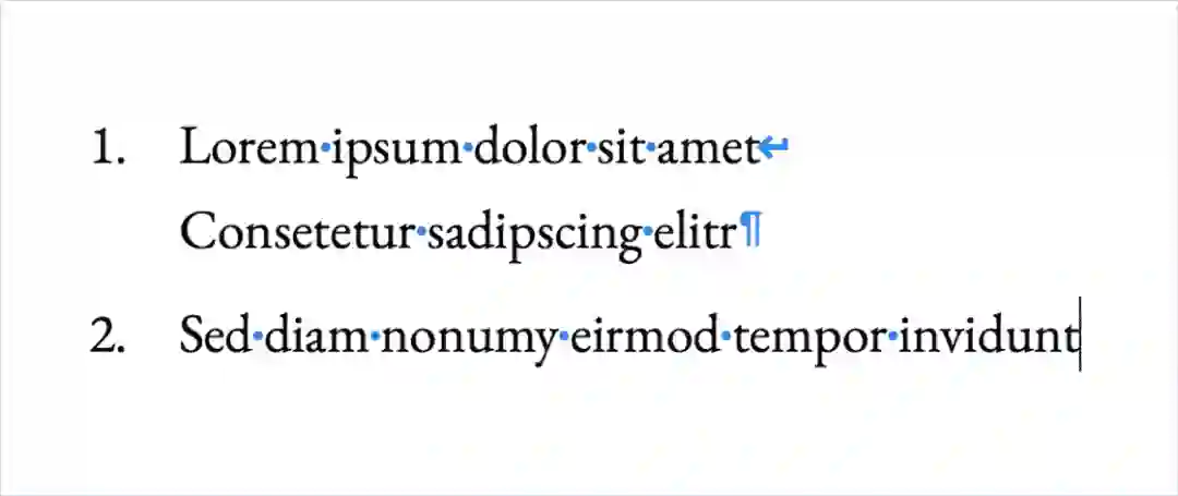 与回车相关的一些疑惑也正来源于这种双重身份。例如,Word 文档打开项目编号时,按下回车就会让段落序号递增,但有时我们只是想让原来的段落新增一行;在微信中,按下键盘右下角的蓝色按键(相当于回车)就会把信息发出去,但有时我们只是想给消息分个段。在这两种情形下,软件都把回车操作理解为控制功能(新建段落或发送消息),尽管我们预期的结果更多是语义上。那么,有没有一个不带控制性含义、纯粹表示换行的「符号」呢?答案是肯定的,这就是所谓的「软回车」,它在 Unicode 中的身份是 U+2028 Line Separator。