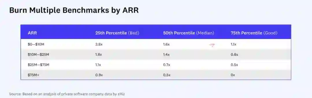 a16z还提出了一个“烧钱倍数”(BM,Burn Multiple)的框架来提醒创业者如何在烧钱增长和赚钱盈利取得平衡。简单来说,就是消耗的现金除以净增ARR(年度经常性收入)的比值。比如消耗了1500万元,产生1000万元ARR,烧钱倍数(BM)就是1.5x。从上表中可以看出,一个好公司价值创造的趋势是,随着公司现金流为正,好公司的烧钱倍数逐步减少,甚至趋近于零。