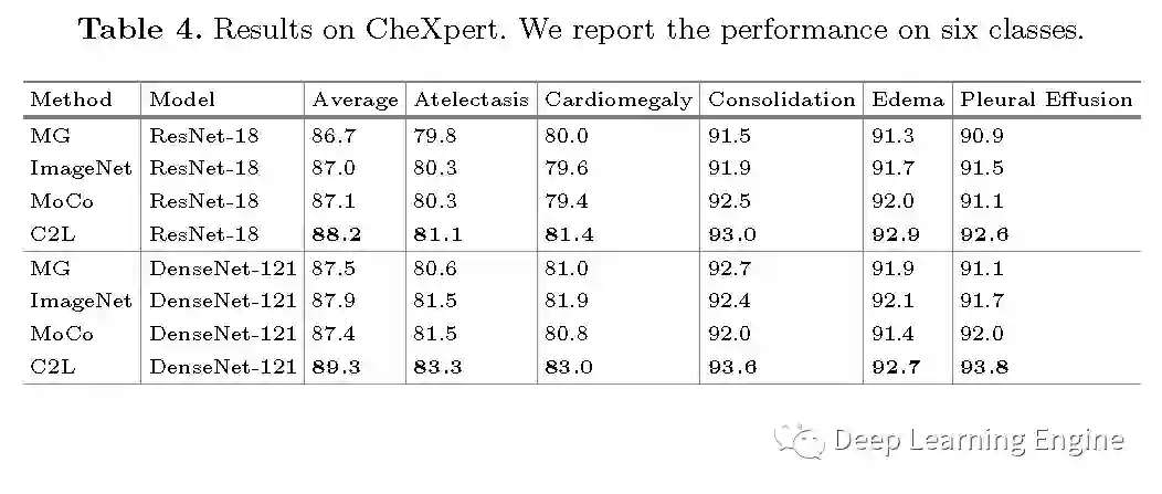 CheXpert数据集中,预训练模型及MG等性能的对比,C2L约有1%的提升。