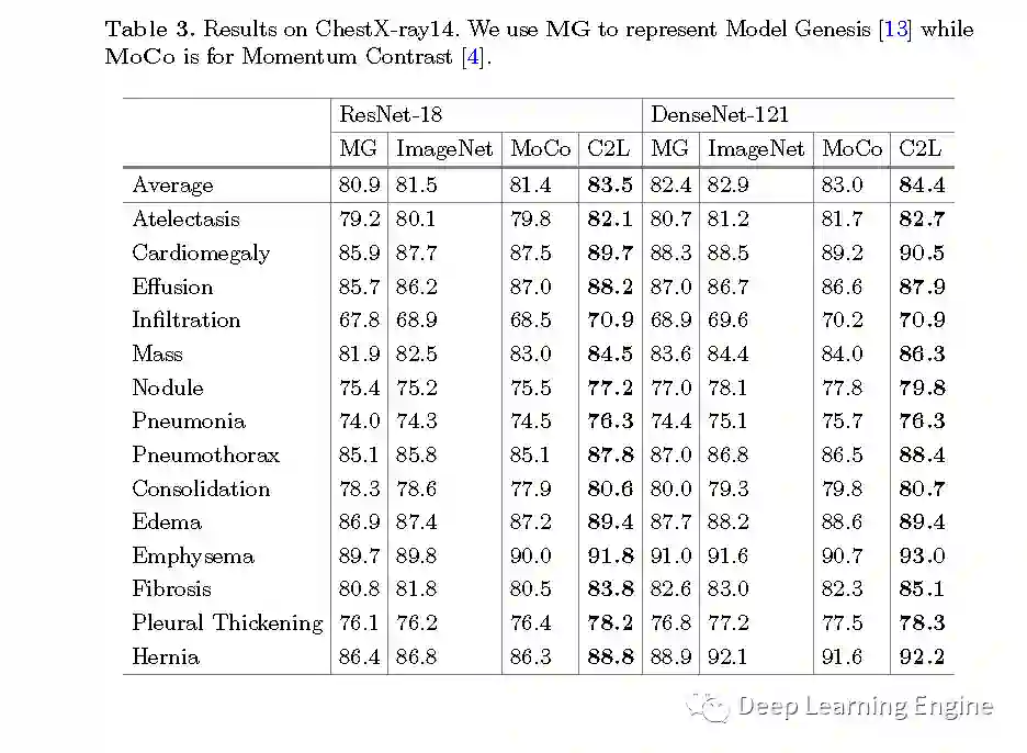 ChestX-ray14数据集上性能的对比。C2L模型性能提升显著。