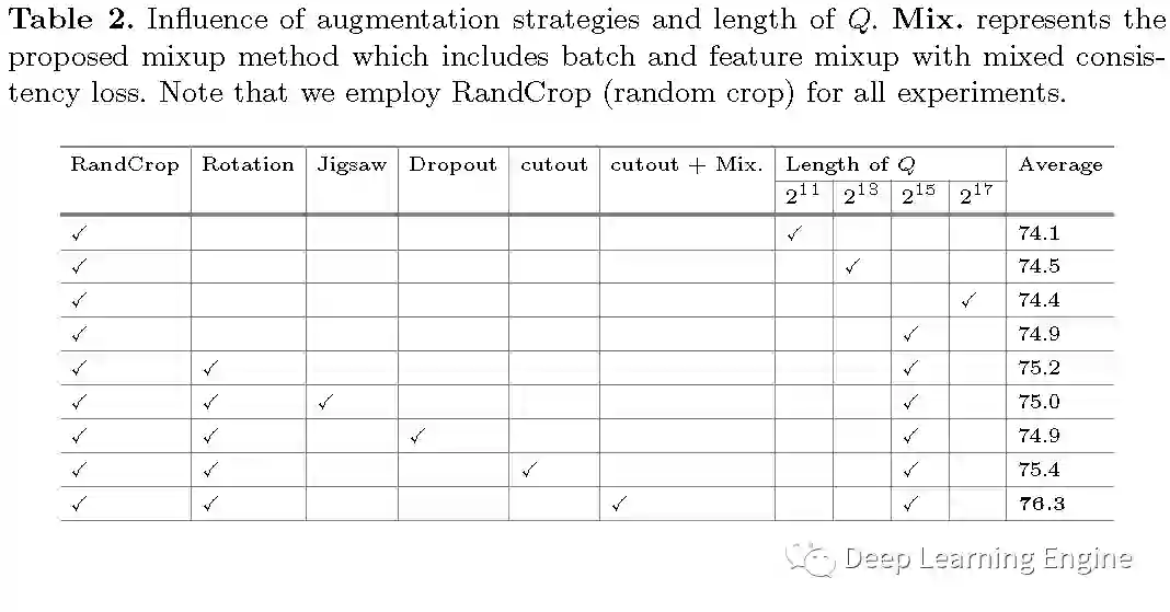 对比数据增强策略和记忆队列Q保存特征长度对性能的影响。