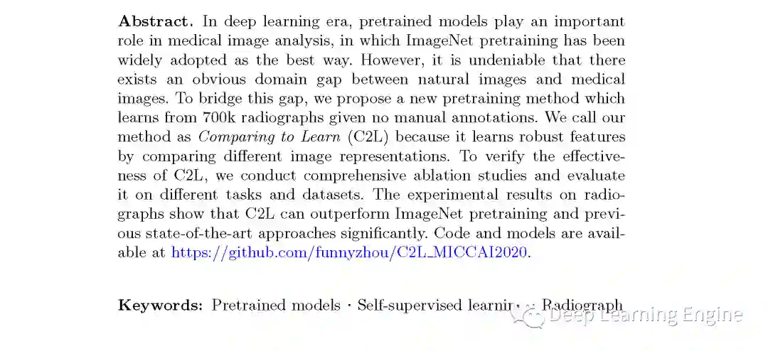 众所周知,医学数据需要该领域专业医师进行标注。这类高质量,多数量的标注数据能够直接提升模型的性能。但医学数据往往因为涉及病人隐私等原因而受到管控和限制,无法获取到大量的带医生诊断结论的数据。那么,开发一种不带标注数据的方法在医学领域就显得尤为重要。一些利用未标注数据进行自监督学习的模型也取得了不错的性能表现,但还无法超过在ImageNet上进行预训练的模型。