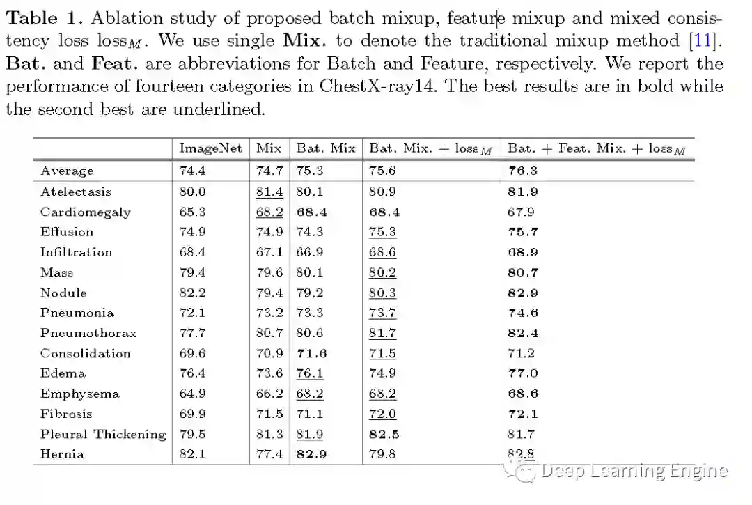 ChestXray14,MIMIC-CXR,CheXpert和MURA四种不带标签的约70万数据进行无监督预训练。只用了ChestX-ray14 进行消融实验以选择合适的超参数。
