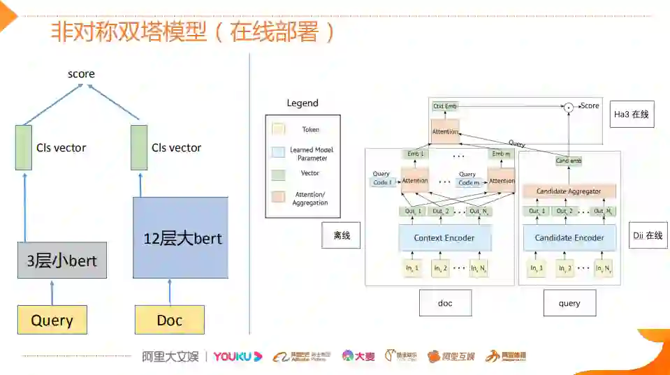 那么怎么消除这个gap?做了两点工作,第一点在线部署时用一个非对称的双塔模型,比如说Doc端可以离线算好存起来。Query端用一个三层的小BERT,因为它考虑到并发性。同时为了降低双塔模型的指标衰减,对于Doc侧,它其实保存的并不是一个Embedding,它是M组的Embedding,M组可以理解为从M个侧面刻画Doc的特征,这样也是为了最大限度的去保留Doc侧的一些丰富的信息。然后再离线侧,可以通过这个比较复杂的12层的BERT去跑它的多组的这种Embedding,然后在线侧用Dii对Query用一个三层的小BERT的产生它的这个Embedding之后,在Ha3侧也就是引擎侧,基于attention去算Query侧的Embedding 和Doc侧M个Embedding 之间的这种权重,之后做一个点乘得到最终的Score。这样做可以说是既让这个指标衰减的不是那么厉害,同时又能够让在线的Query侧的特征抽取能够保证线上的并发效果,只这么做其实还是不够的。因为这个Query侧的模型换成小模型之后,它的指标会进一步衰减,为了减缓这种衰减,采用了一个多阶段的蒸馏方案。