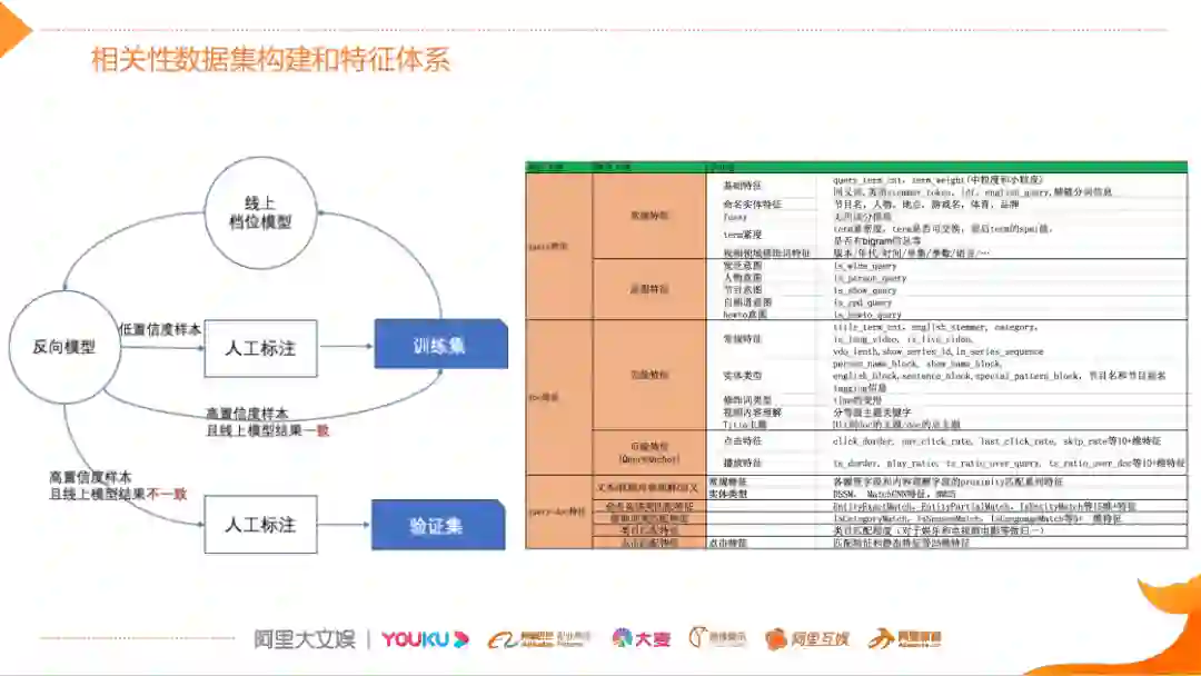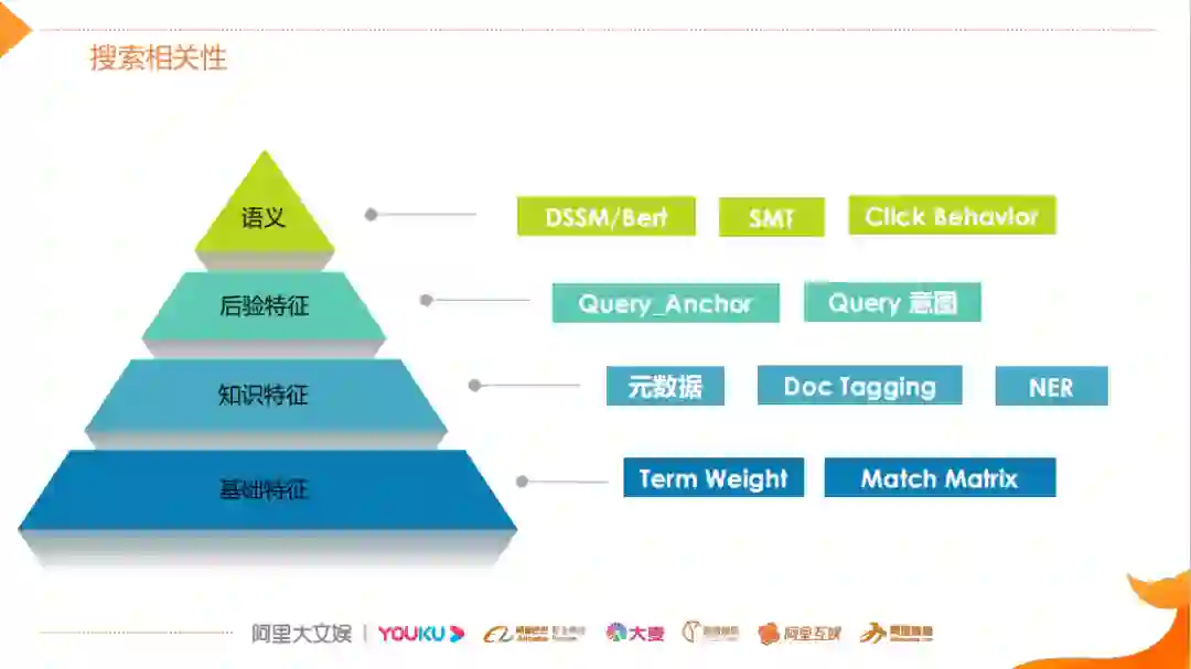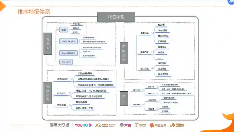 基于相关性的特征,上层排序在特征基础之上做一些整合和丰富。这里主要分为四大块的排序特征体系,那么除了Query和DOC以及它们的匹配特征之外,这些都是各业务领域通用的,比如除了技术匹配类、Query统计之外,还会增加一些视频平台所特有特征,比如说实时播控,它是为了解决排序除了体验目标之外,还要解决分发类的目标,因为它在决策领域很重要。