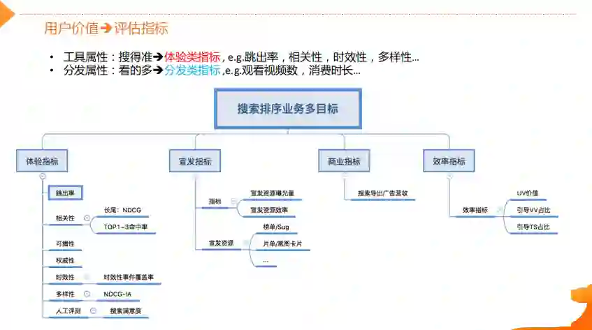 搜得到搜得准,既是用户价值的基础也是搜索的基础属性。从这个维度去评估搜索效果的好坏,就需要一系列的体验类的指标(跳出率、相关性、时效性和多样性等等)。可播性是视频搜索特有属性,是指视频能不能在优酷平台上进行播放。受内容版权以及监管方面的原因,有些内容是不可播放的。此外,还会定期去通过人工评测的方式来对搜索效果满意度做横向以及纵向的对比。