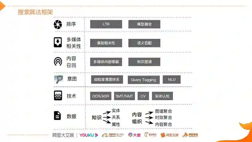基础技术层:在数据层基础之上,利用基础的CV技术以及NLP能力来支撑上层对Query意图的理解、内容的召回以及后面的相关性和排序。意图层需要理解用户Query的意图是什么。首先对Query做成分的分析(Query Tagging),Tagging就是说标明Query中各个成分是什么意思(比如“步步惊心吴奇隆”这个query,需要识别出“步步惊心”是一个节目名,“吴奇隆”是一个人)。然后基于这些信息建立细粒度的意图体系,对用户表达的意图做深层次的理解(比如需要理解用户的query是想找节目的意图,还是看人物的周边信息以及通用的知识类的意图),基于这些意图可以去指导上层的召回相关性排序。