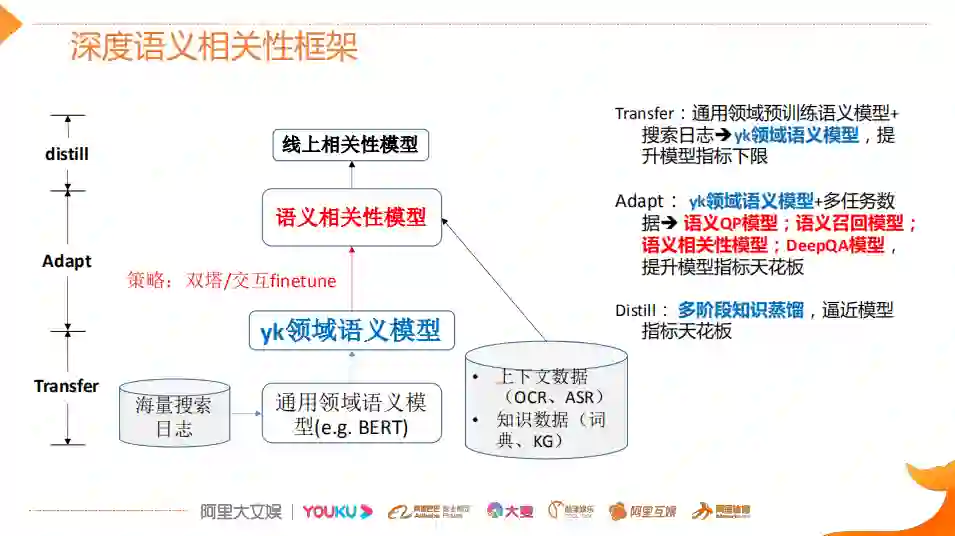 第一个阶段transfer:它主要用到通用领域的预训练的语言模型(比如说谷歌或哈工大训练出来BERT),然后用优酷搜索日志对它进行重新的一个pre-train这样就得到了优酷领域的语义模型,那么这个模型的目的是为了提升模型指标的下限,它往往能够提升base BERT的2%-3%的指标。基于transfer阶段之后,获得了一个优酷领域的语义模型。