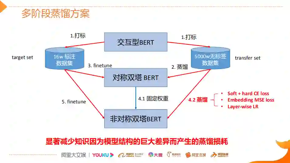 给大家介绍一下多阶段的蒸馏方案。如图有两份数据,一份数据为transfer set,它是一个5000w的无标签的数据及优酷的点击日志;第二份数据为target set,它是一些人工标注的数据集。