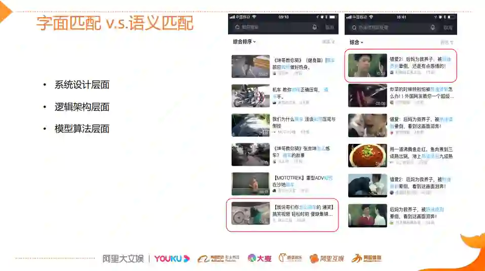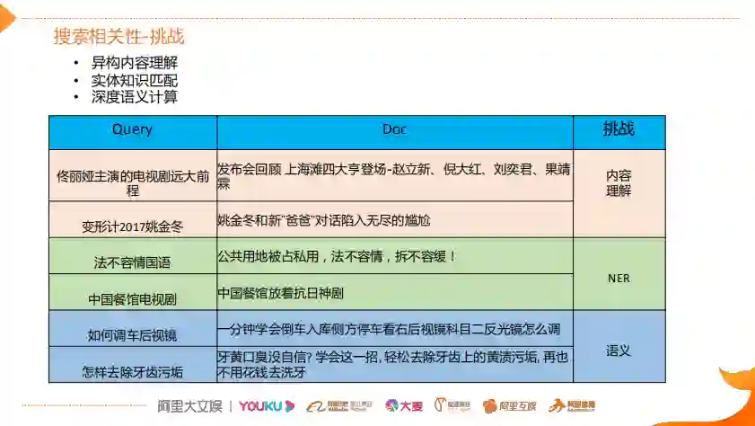 异构内容理解:表中的两个帖子,用户Query和视频标题Doc从字面上来看,是不相关。通过对视频内容进行理解,丰富元信息,建立异构内容的相关性。(比如,用户Query“变形计2017姚金冬”,Doc中只有姚金冬,实际上通过视频内容的理解可以知道姚京东和变形计的关系,同时知道是2017年拍摄的。)所以通过对内容理解和IP指纹,比如把IP周边的这种视频和IP本身关联起来,就能够丰富视频的元信息,提升异构内容的相关性匹配度。