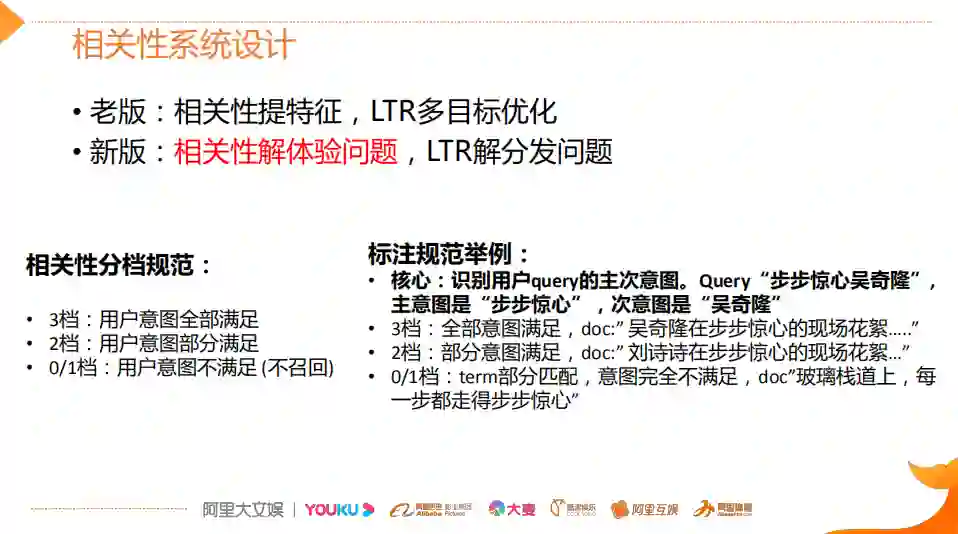 老版相关性是用来提各种特征,LTR基于这种特征做一些多目标的优化。该方法存在问题,即其将体验类问题和分发类问题耦合在一起,使得LTR学习的并不是很好。因此,新版的相关性系统设计就和LTR做了明显的功能上的划分。新版相关性主要解体验类问题,LTR解分发的问题,这样将体验问题和分发问题进行解耦,这里并不是说LTR就不管体验类问题了,而是互为兜底。这样做有两点好处,第一点能够提升整个搜索结果的秩序感,给用户提供他们最想的内容;第二点在秩序感的保证基础之上,通过LTR可以增加用户的粘性来引导用户看的更多。