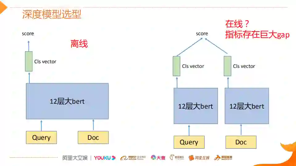 深度模型选型这块,其实大家都比较清楚,左图是传统的BERT的用法,它是一个交互型的,离线可以这样使用,而且本文也是这使用的。但是在线,因为考虑到性能的压力,往往都会选择这种双塔的结构,那么双塔的结构,它和交互型的这种BERT相比,它虽然效率提升,但是它的指标是存在着比较巨大的gap。