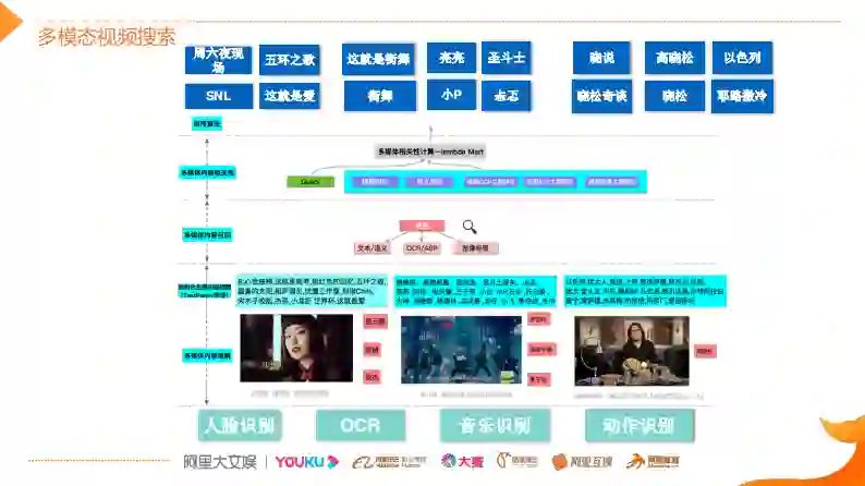 优酷的多模态搜索采用的是一个三阶段的解决方案。第一阶段利用CV技术将其它模态(如图片、视频)的信息降维到一个文本模态,将其做结构化的内容理解。第二阶段通过多模态的内容检索实现召回,在上层通过多模态的内容相关性排序算法达成最终的动态的检索效果,比如上图中《这就是街舞》,基于人脸识别技术能够识别出视频中出现的明星人物(易烊千玺、黄子韬等明星),然后通过OCR和AR技术来识别视频中的对话内容并转化成文本,最后基于文本去做结构化的理解。结构化的文本需要有系统性的理解和组织,本文主要是利用关键词的抽取进行核心概念的理解,并形成内容主题。同时还会利用音乐识别、动作识别、场景识别等等CV技术,来不断丰富视频的结构内容,从而做到在用户做各种组合搜索的时候,系统都能够召回而且排序结果比较好。