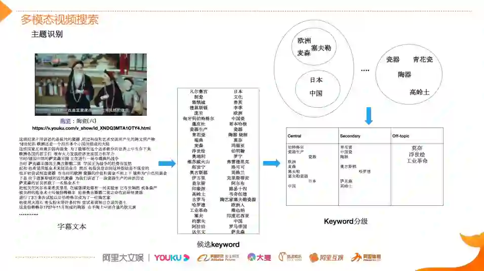 如图,该视频讲的是欧洲陶瓷,但是它的标题非常简单就是陶瓷这几个字,字幕文本是利用OCR技术识别出来的。字幕文本所承载的内容关键词词数非常大,此外,内容和关键词属于多得多的关系,所以通过多样化的关键词抽取技术来提取候选关键词,同时能够扩大候选词来源的多样性。基于NER的方法能够确保抽取的关键词是百科类的实体,有比较广泛的知识内涵。而新词发现的方法,它结合N-gram以及语言模型等多种能力来扩大对未知知识领域的挖掘。挖掘的候选关键词的量其实是非常大的,在关键词基础之上,根据视频的内容和候选词的匹配程度或者说相关性来进行关键词的分级,通过分类模型将其分类成最核心的关键词,有普通的关键词以及提及关键词。关键词分级的核心特征除了文本特征之外,还会采用音频、视频等多模态的特征来共同训练,进而提升分类准确率,将关键词和内容表达的关联度预测更加精准。在这一过程中会面临一些挑战,比如这个视频讲的是欧洲瓷器的发展史,但是视频标题很简单。我们虽然把内容将变成文本之后,能够利用前面提到的关键词提取技术抽取出欧洲、麦森和塞夫勒等关键词,但是如何把这些关键词和欧洲联系起来,理解这个视频讲的是欧洲的发展史,而不是中国或者日本。此外,对于瓷器领域(比如陶青花、瓷高岭土)的知识实体,怎么知道该实体和瓷器讲的是类似的事情,那么这里就需要有科技作为支撑了。因为科技的实体知识库能够涵盖比较广泛的领域,比如说全行业的丰富的实体信息,能够帮助提取核心内容主题。此外,算法还需要有实体间的关系推理的能力,才能更加全面的理解视频,然后更好地支撑上层的召回、匹配和排序。