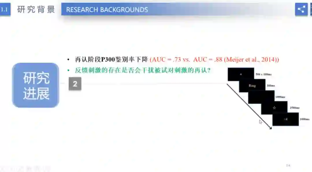 在上一个研究中,赛博士发现,再认阶段P300鉴别率下降。因此,为了探究反馈刺激的存在是否会干扰被试对刺激的再认,赛博士设计了试验并得出结论。结果显示反馈刺激对再认阶段的P300没有影响。