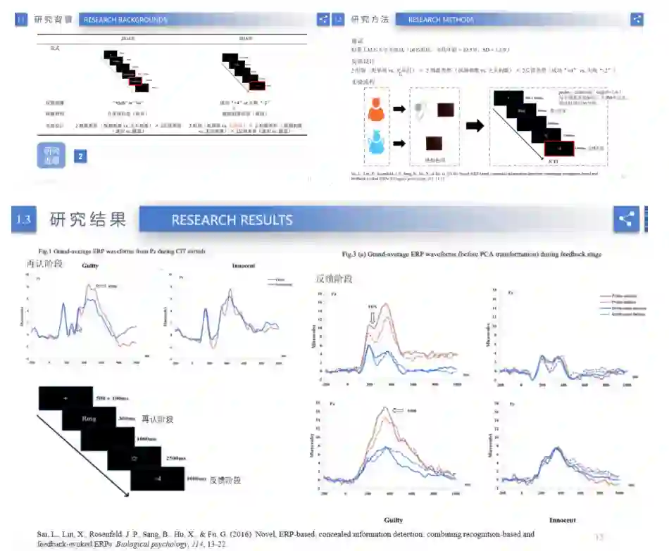 准确地探测谎言对国家安全和司法审判都具有非常重要的意义。自20世纪80年代以来研究者开始探索基于脑电的隐藏信息测试方法,以往大部分的研究主要关注的是与犯罪信息再认相关的P300。自2014年以来,赛博士团队致力探索反馈相关的脑电成分应用测谎的可能性,并在此基础上提出采用再认与反馈相结合的方法联合测谎。本报告主要介绍反馈隐藏信息范式相关的系列研究以及对虚假身份的初探研究。