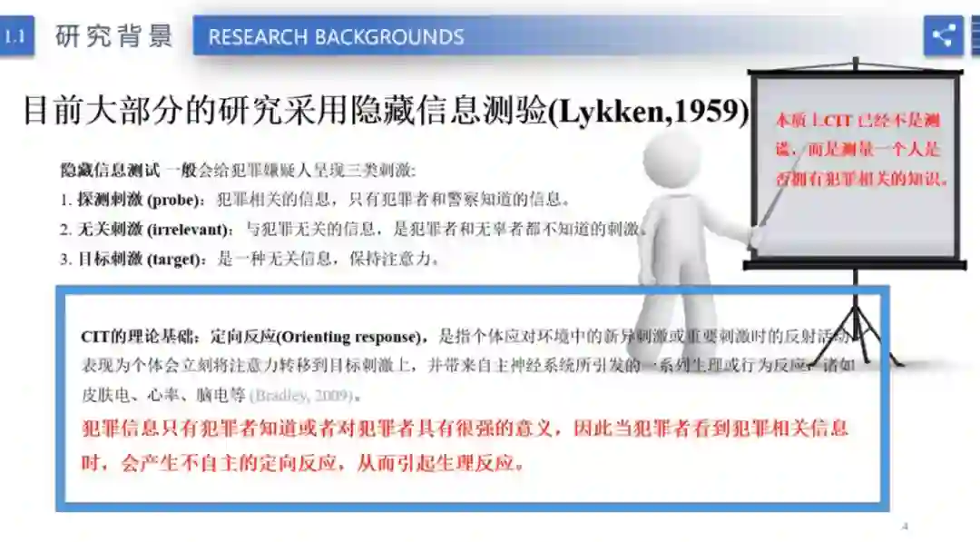目前,大部分的测谎研究都采用的是隐藏信息范式,赛博士在报告中对该范式进行了详细介绍。