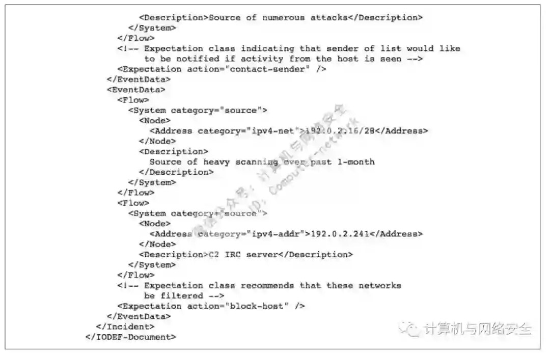IODEF在2007年首次发布的RFC 5070中被定义为“供计算机安全事件响应小组(CSIRT)在计算机安全事件交换时使用的信息共享框架的数据表示”。IODEF是一种基于XML的标准,由反钓鱼工作组和ArcSite等组织使用。其中包括敏感度和置信度标签。图2展示了原始RFC的扫描捕获信息的IODEF格式示例。