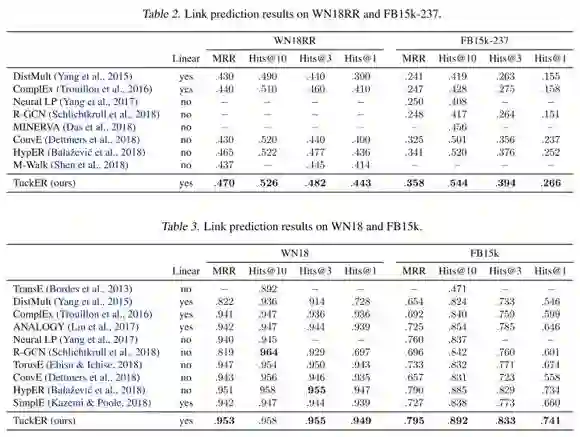 本文的主要实验任务是 link prediction。数据集采用了当前流行的 FB15K-237 和 WN18RR,同时也测试了传统的 FB15K 和 WN18。作者开源了基于 PyTorch 的代码https://github.com/ibalazevic/TuckER。实验结果如下表所示。可以看见,在目前主流的FB15K-237 和 WN18RR 数据集上,TuckER 取得了 SOTA 的效果,并且比第二名领先较多。而在传统的 FB15K 和 WN18 上面,TuckER 在主要指标上,也取得了最优结果。基本可以认为,TuckER 是当前 link prediction 的 SOTA 模型。