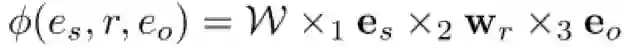 其中,es 和 eo 表示实体向量,wr 表示关系向量,de 和 dr 分别表示实体和关系的向量维数,W是Tucker decomposition得到的核心张量。则TuckER的得分函数定义如下:
