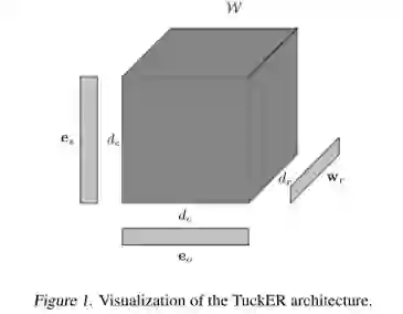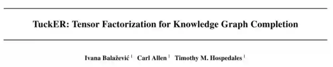知识图谱是图结构的数据库,以三元组(es, r, eo)的形式存储事实,其中es和eo分别表示主语和宾语实体,r表示它们之间的关系。然而,知识图谱中的事实是不完备的,人工补全费时费力,这就需要开发自动化补全知识图谱的算法。知识图谱可以表示为一个三阶二值张量,其中每一个元素表示一个三元组,1表示真实三元组,0表示未知三元组(或错误或丢失)。因此,很多基于张量分解的补全模型被提出。本文基于Tucker decomposition, 它可以将一个三阶张量分解为一个核心张量每一维度乘上一个矩阵。令是一个三阶张量,Tucker decomposition 会产生一个核心张量