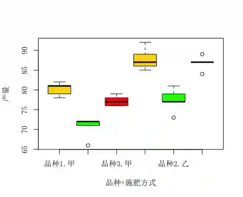 > boxplot(产量~品种+施肥方式,col=c("gold","green","red"),ylab="产量",xlab="品种+施肥方式", data = example8_5)