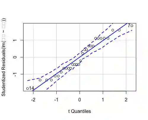 > qqPlot(lm(产量~品种))
