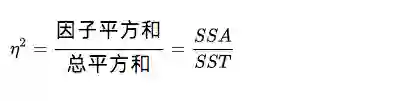在单因子方差分析中因子平方和与总体平方和之比,它反映量在因变量取值的总误差中被因子解释的比例,效应量越大说明自变量与因变量之间的关系就越强。公式为: