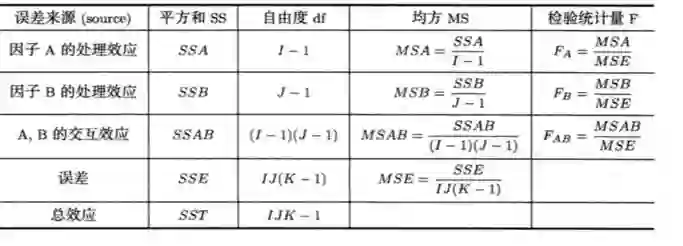 考虑交互效应的双因子方差分析表