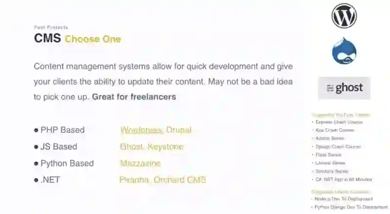 内容管理系统允许快速开发并为您的客户提供更新内容的能力. 在你需要快速开发网站的时候, 它们是很适合的. 特别是对于自由开发者.