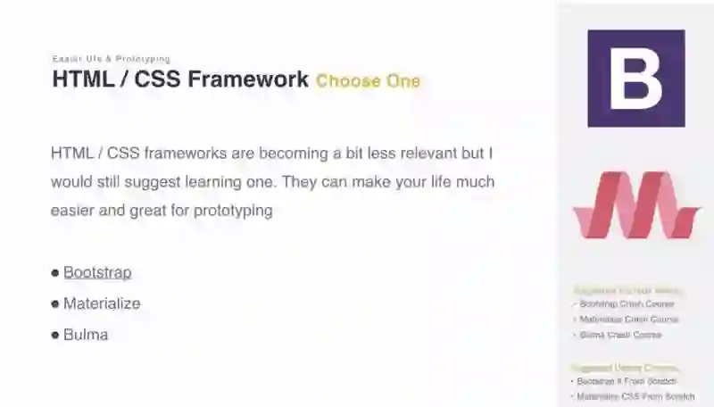 HTML/CSS框架目前没有以前那么有意义, 但是我还是介意你选择一个学习(这里作者想隐射的应该是, 在jquery时代, HTML/CSS框架的学习是必须的).