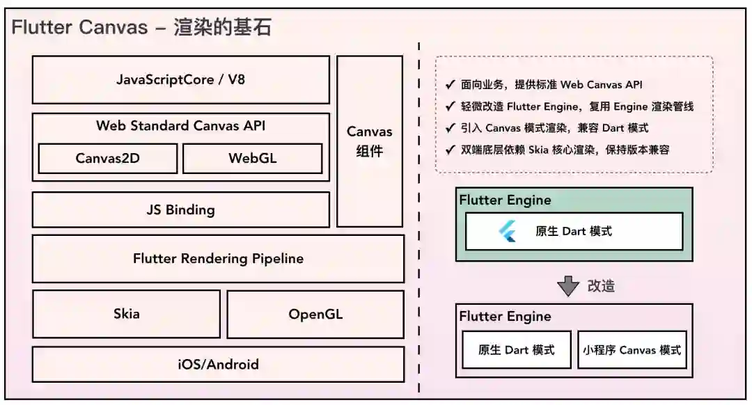 保证原生的 Dart 模式可以正常运行,Canvas 模式和 Dart 模式在 engine 创建时可以动态指定,为后续的 Flutter 业务提供更好的基础。