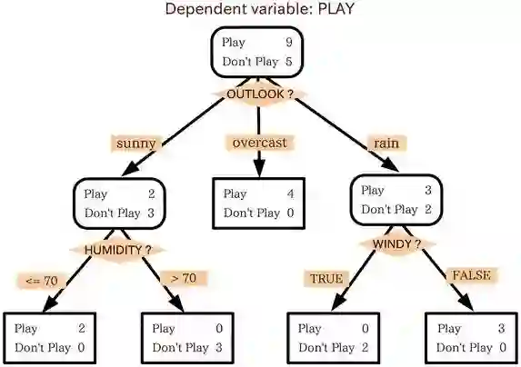就像上面这个例子,训练集由三个特征:outlook(天气),humidity(湿度),windy(是否有风)。