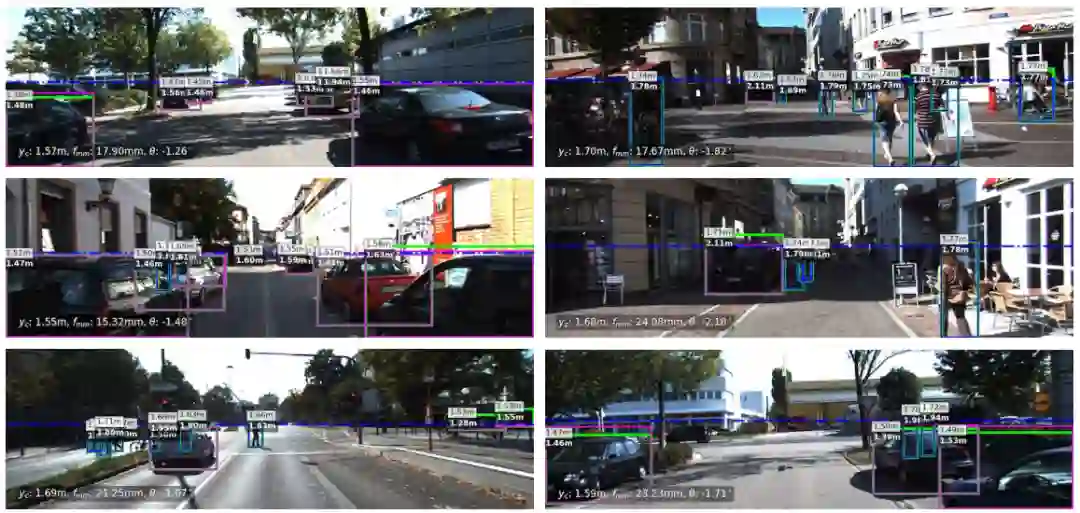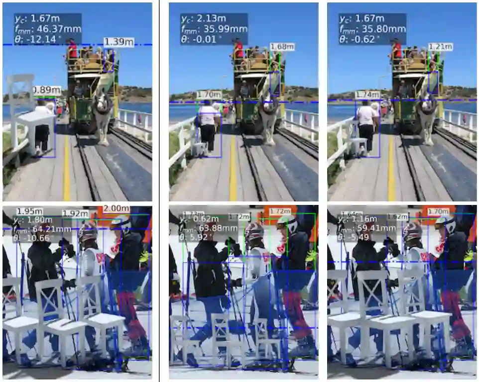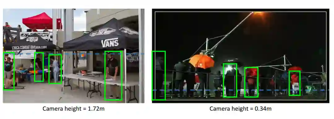 在预测得到前面的相机参数和目标参数基础上就可以开始预测相机的高度了。这一模块通过相机高度与2D bbox和其他相关参数间的几何约束来进行预测。例如在下图中,两个图片中都有站着的人,但水平线都不完整。粗略一看拍摄图片的相机都有相同的朝向,但高度却大相径庭。这样的情况下直接从图像进行估计会带来较大的误差,所以模型使用了中层的特征表达 (包括目标的bbox和估计出的水平线) 来进行相机估计,输入包含了光心、bbox、检测框的偏置以及目标高度共八个参数,最后通过预测出概率分布的加权平均得到相机的高度。