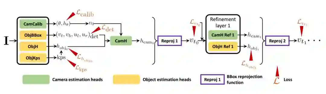 首先通过几何相机标定网络将同时估计出目标bbox和除相机高度外的所有相机参数,这些参数可以通过现有的数据集进行直接的监督训练。随后级联的网络用于优化相机高度,这一部分通过bbox的重投影误差进行弱监督训练。