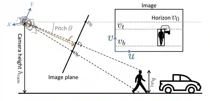 这整套方法首先从建立完整有效的几何约束开始,基于成像过程建立了目标的高度、2D bbox尺度、相机的参数朝向和距地面的高度等变量间的约束关系。下图显示了研究中提出的成像过程。
