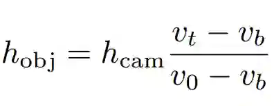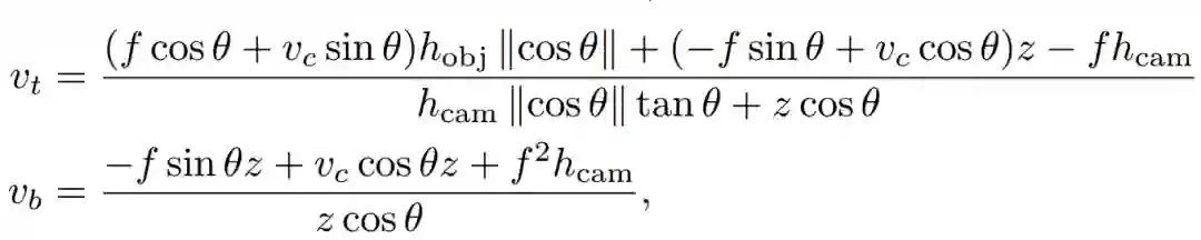 其中 [uc,vc] 是相机的光心坐标假设已知。从上面的公式中可以利用焦距f、pitch角、相机高度和目标高度等计算出出vt。再假设pitch角度很小,那么上面的式子可以简化为:、