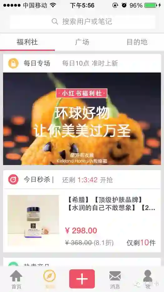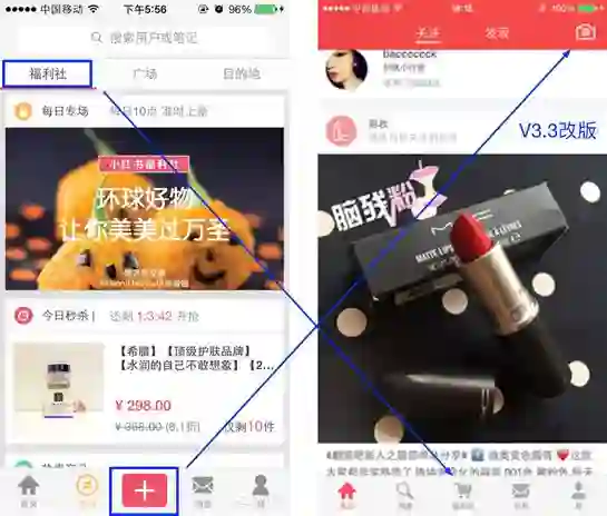 在后面的迭代中,小红书团队又重新将发布按钮放到原处,同时,将福利社移植到底部第二个Teb位置,算是产品摸索时期的一个小插曲,也是小红书团队认清自我的一次短途。