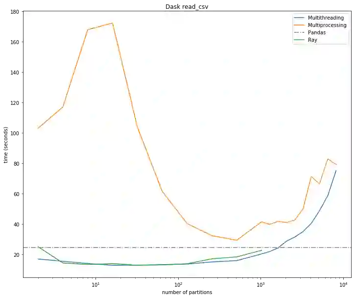 在 AWS m5.2x 大型实例(8 个虚拟核、32GB 内存)上,我们使用 Pandas、Ray 和 Dask(多线程模式)进行了 read_csv 实验。