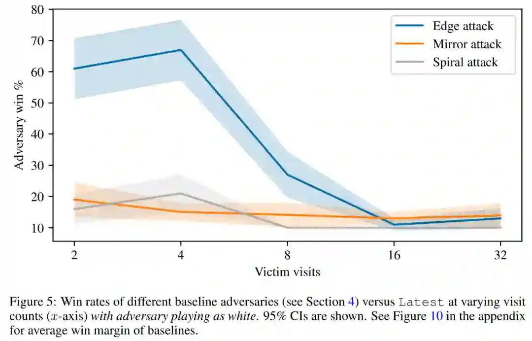 研究者还评估了对 Latest 的最佳对抗策略检查点,取得了超过 99% 的胜率。并且,如此高的胜率是在对抗策略仅训练 3.4 × 10^7 个时间步长的情况下实现的,这一数据是受害者时间步长的 0.3%。