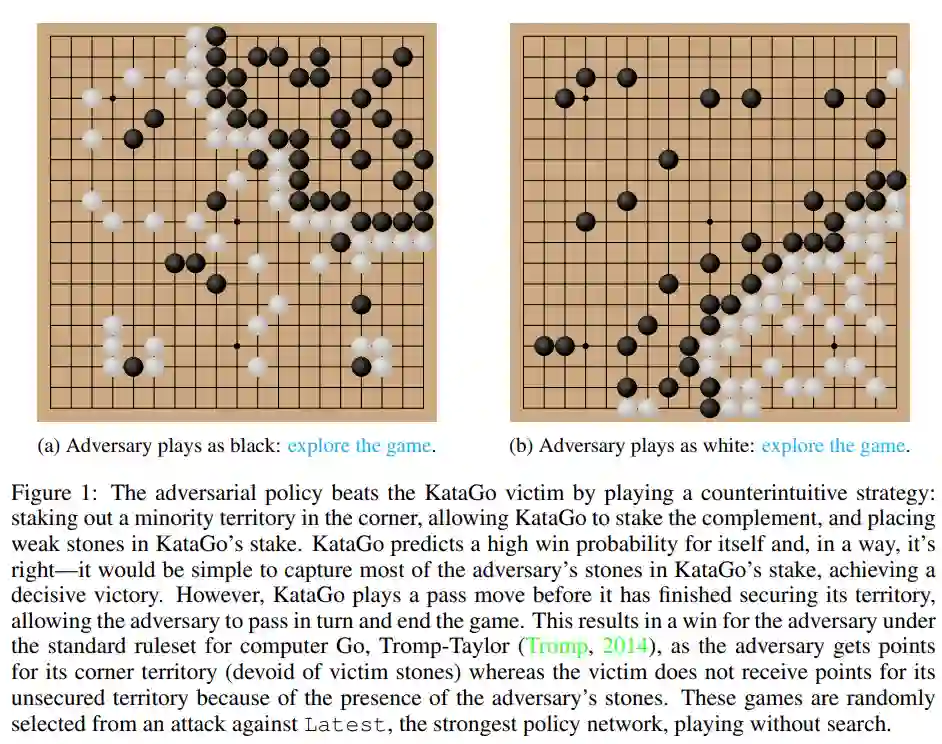这里我们有必要说一下 KataGo,正如本文所说的,他们在撰写本文时,KataGo 还是最强大的公开围棋 AI 系统。在搜索的加持下,可以说 KataGo 非常强大,战胜了本身就是超人类的 ELF OpenGo 和 Leela Zero。现在该研究的攻击者战胜 KataGo,可以说是非常厉害了。