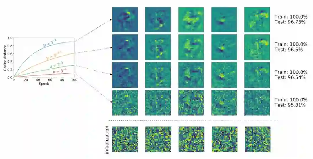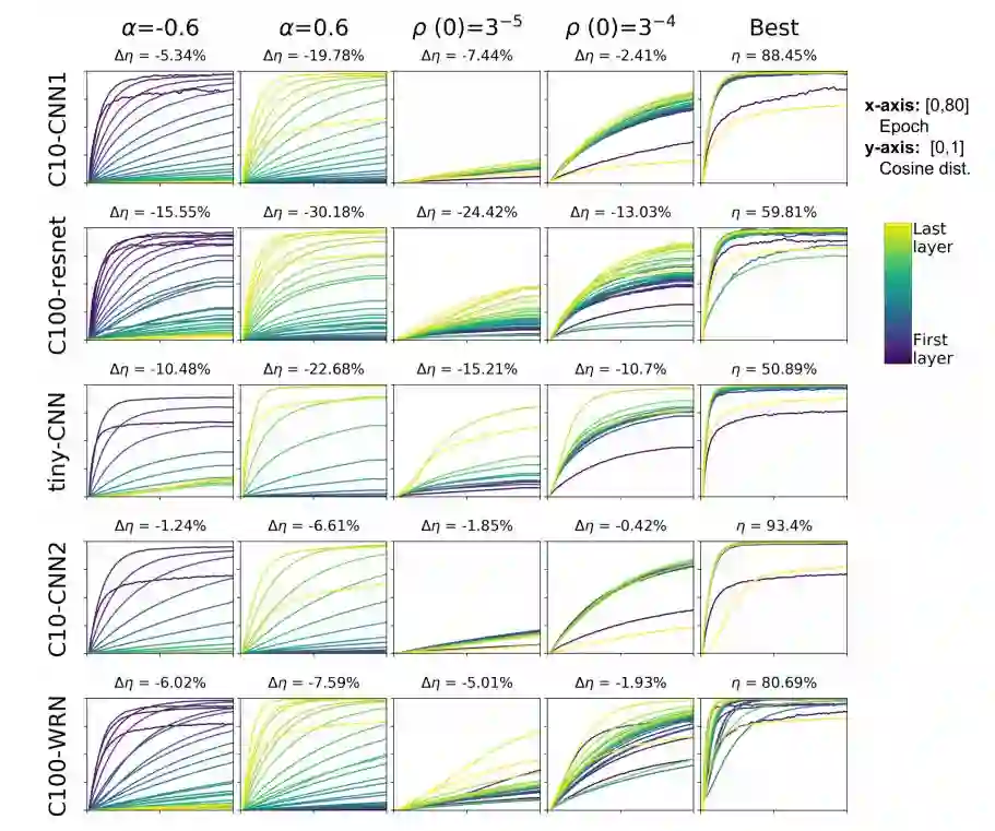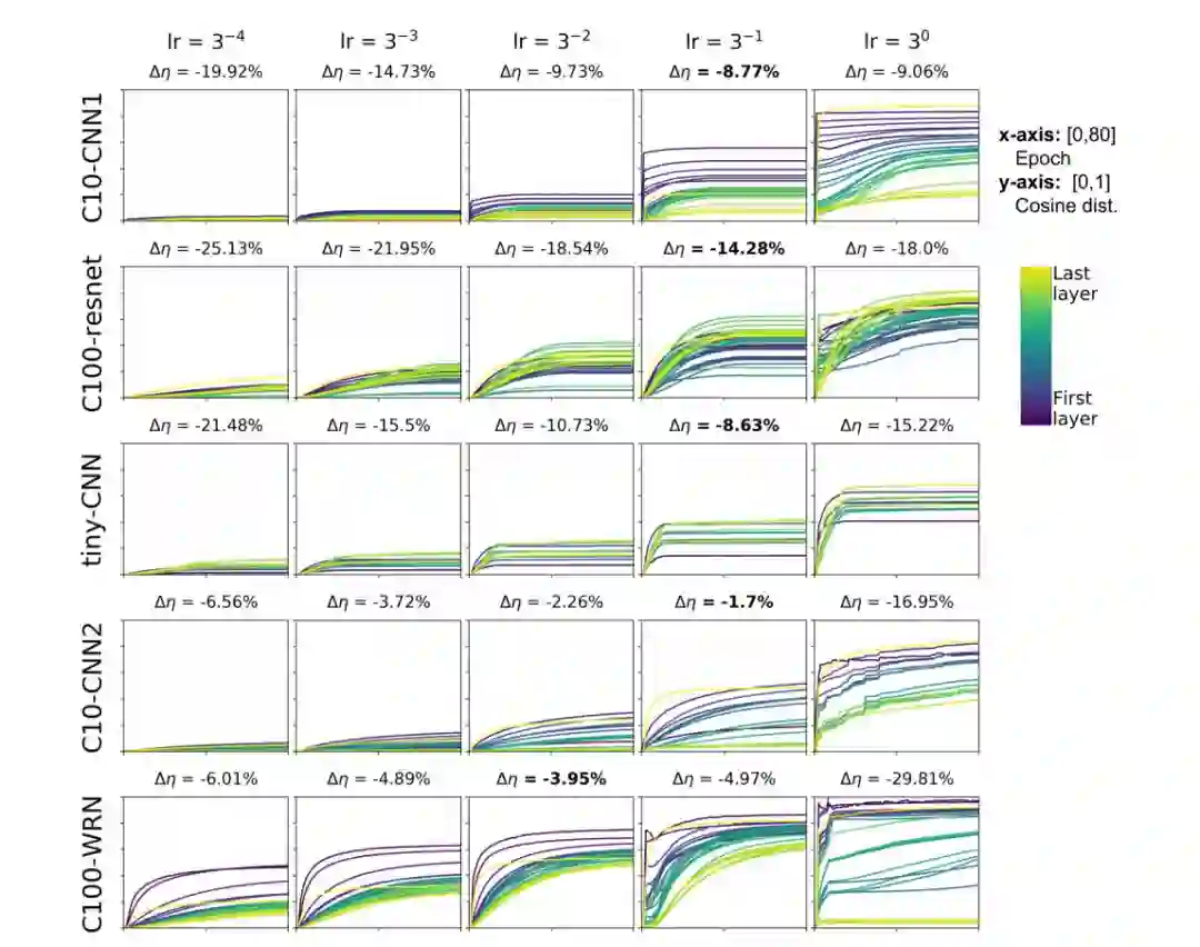 有趣的是,这种关系证明了一种与网络无关的最优状态:在训练过程中,所有层的权值从它们的初始状态变化到余弦值等于 1 时,性能总能优于其它的配置情况,其测试准确率要高出百分之 30%。此外,我们说明了层旋转非常易于检测和控制,有助于超参数调优)。层旋转还能提供统一的框架,从而解释学习率调优、权值衰减、学习率预热和自适应梯度方法对泛化和训练速度的影响。